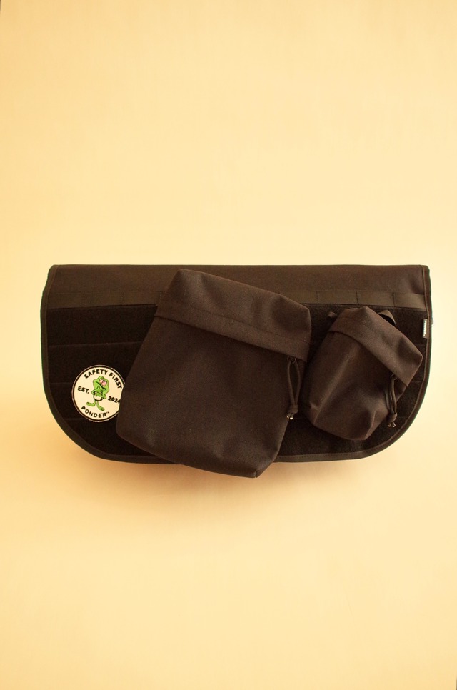 Ponder™ Original Messengerbag "Opossum" sewing by AGHARTA col BLACK material CORDURA® x PVC size ONE 横50cm 縦26cm マチ21cm frogワッペンが一枚付属 オポッサムとゆう動物のママの背中に抱っこされる様をサンプリングした Ponder™オリジナルのメッセンジャーバッグ。 バッグフラップ全面を覆うベルクロ生地にはオプションポーチやワッペンなどのカスタムが可能。 商品名オポッサムの名前のとおりフラップにいろいろとくっつけて背負えます。 フラップ上部にはモールシステムのように脱落防止のためのウェービングベルトも。 ※新品のベルクロ生地状態ですので使い始めはカラビナやインシュロックで固定しておくことをオススメします。 自転車で釣りにいくとゆうコンセプトのもと 街とフィールドとのクロスオーバーな使用シーンを想像したミドルサイズの容量。 バッグ底部分には、パックロッドなどのタックルを固定できるバンジーコードをセットしていて、自転車ライド時には熱くなってきたらアウターなども同じく固定できます。 電車通勤時や屋内での買い物の際にはこのディテールが重宝するかと。 バッグのベルトは着脱が容易なシステムであり、右かけ左かけを変えれるようになっています。 ベルトを外すとWELDバスケットにも入るのでフロントバッグにもなります。 バッグ内側には荷物を取り出しやすいようオレンジのターポリンを張り付け、バッグ外面には一つポケットを装着しています。 容量がこころもとない方は専用のオプションポーチも用意しています。 テストにたくさん時間をかけ、呑んで・釣って・漕いでの繰り返しの日々。 上記男の三大欲求を上手に各ディテールへと落とし込んだ思考嗜好のPonder™オリジナルメッセンジャーバッグです。 for ALL BIKE and FISHERMAN